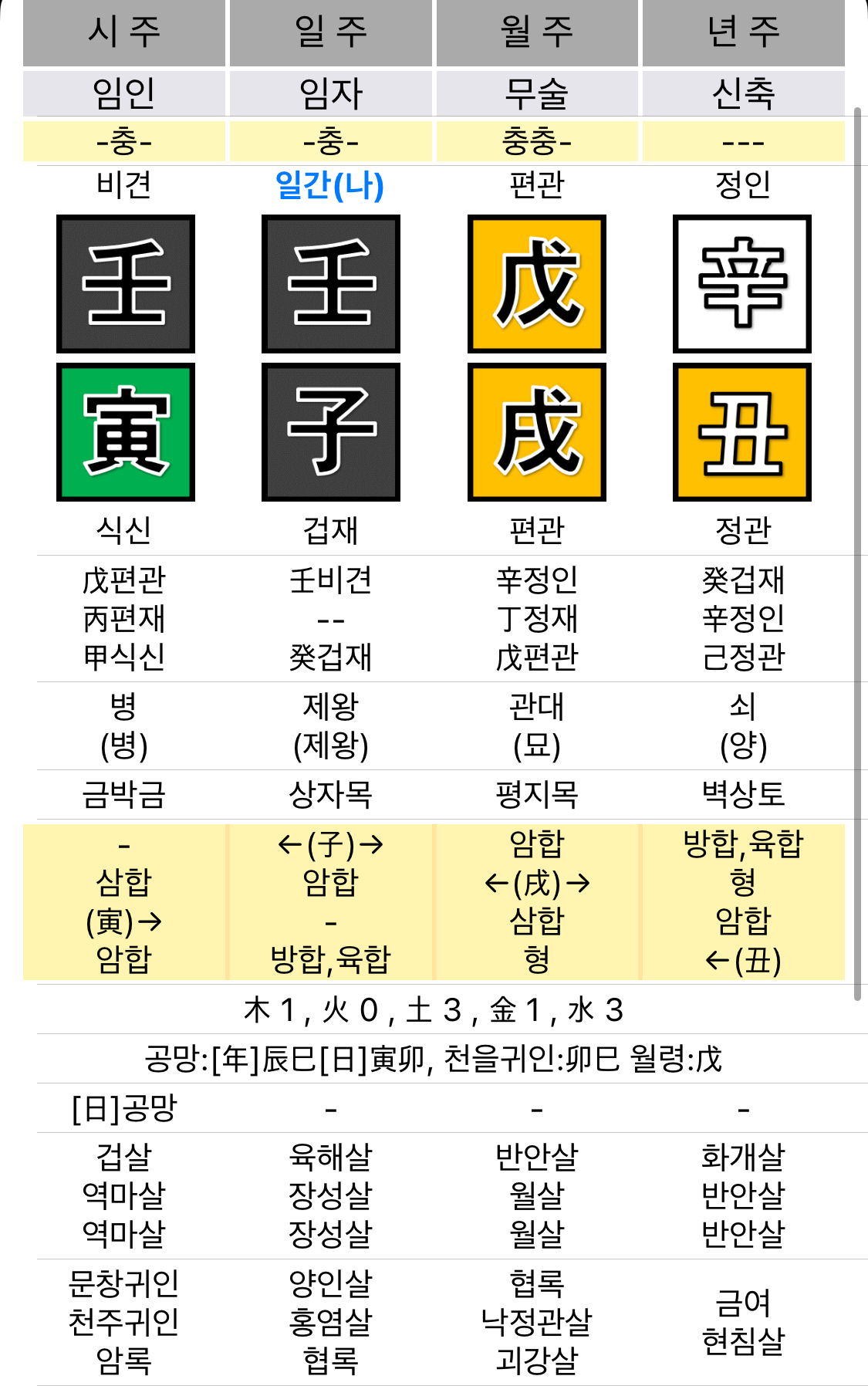 - 술토 속 신금은 편관이며, 일간 임수(壬水)에게는 편관에 해당합니다.