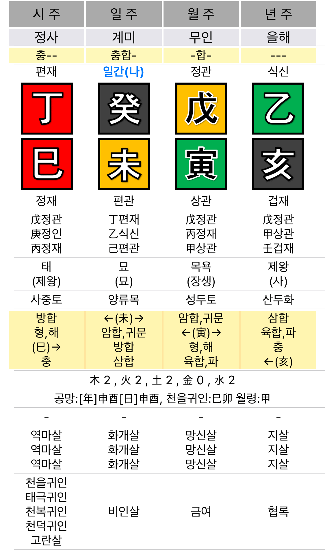 - 정사시: 편재(정화) / 정재(사 중 정화)