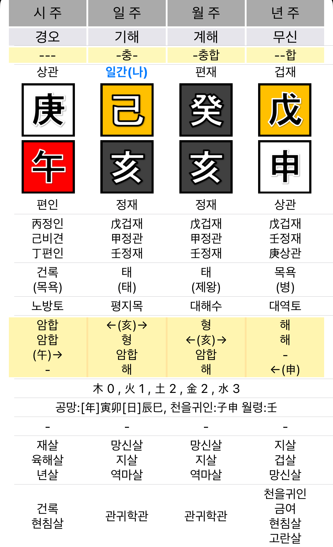 - 무신(년지), 해(월지), 해(일지) → 신해해 구조