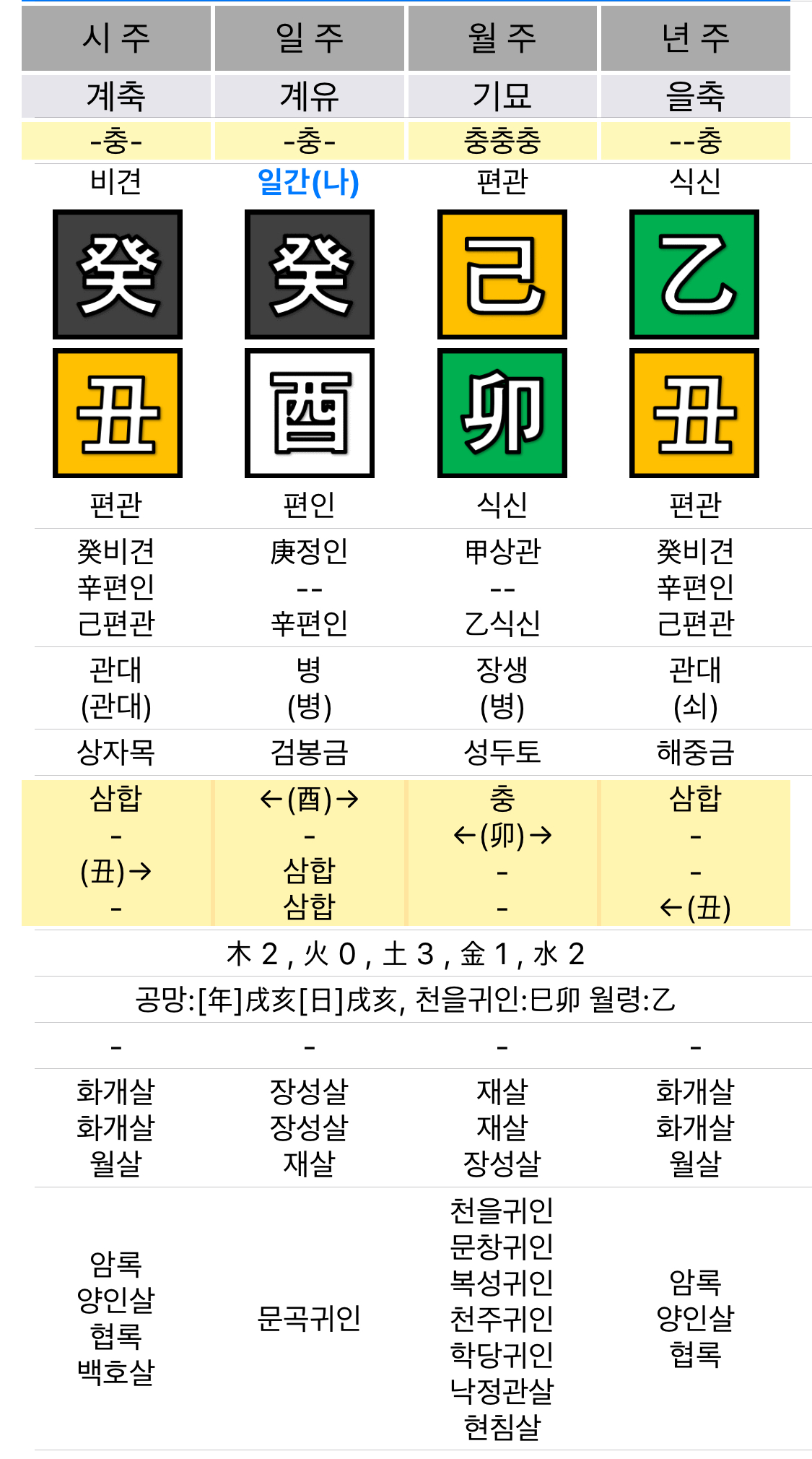- 을(陰목), 축(陰토), 기(陰토), 묘(陰목), 계(陰수), 유(陰금) → 전부 음오행.